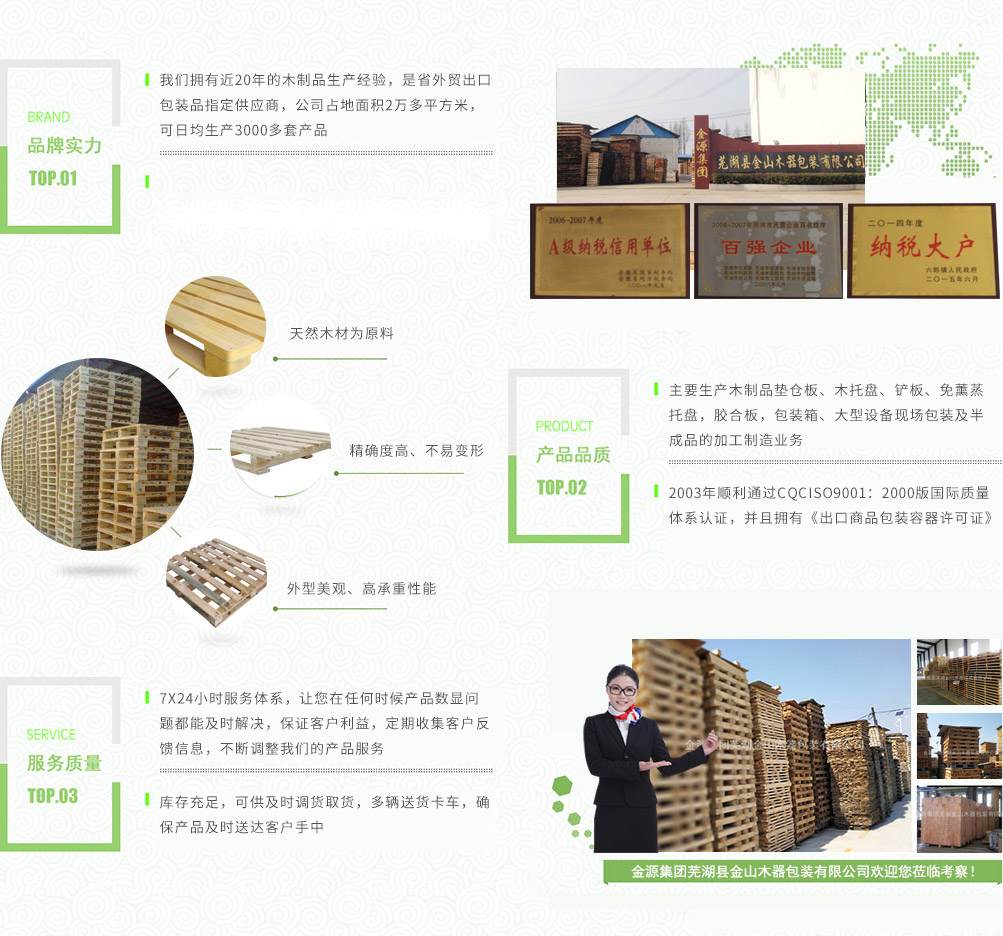 金源集團(tuán)蕪湖金山木器包裝有限公司是省外貿(mào)出口包裝品指定的供應(yīng)商,主要生產(chǎn)木制品墊倉板、木托盤、鏟板、免薰蒸托盤,膠合板,包裝箱、大型設(shè)備現(xiàn)場包裝及半成品的加工制造業(yè)務(wù)。產(chǎn)品廣泛用于物流,倉儲,港口,碼頭,機械,建材,化工,紡織,食品,超市,五金電器等行業(yè)。公司占地面積2萬多平方米,注冊資金壹佰壹拾捌萬圓整,公司擁有員工160多人,其中技術(shù)人員占25%,可日均生產(chǎn)3000多套產(chǎn)品,年產(chǎn)值6000多萬元,公司下轄木材加工廠,組裝廠,并備有大型標(biāo)準(zhǔn)烘房,多功能平板刨,壓刨,挖槽,機械設(shè)備等。產(chǎn)品主要銷往國內(nèi)大中型城市并隨貨通行出口國外。